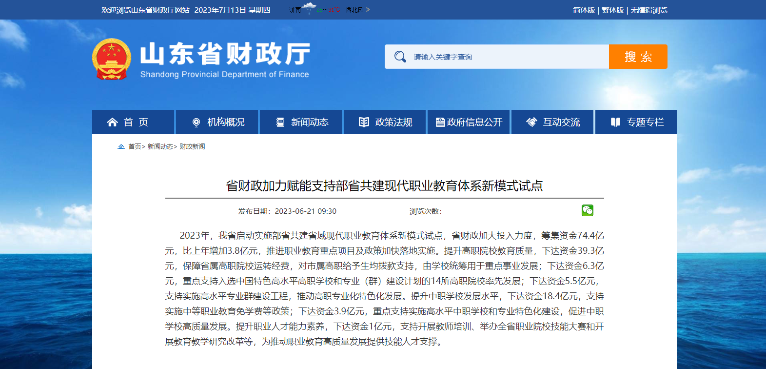 山東省財政廳官網(wǎng)發(fā)布,2023年,山東省啟動實施部省共建省域現(xiàn)代職業(yè)教育體系新模式試點(diǎn),省財政加大投入力度,籌集資金74.4億元,比上年增加3.8億元,推進(jìn)職業(yè)教育重點(diǎn)項目及政策加快落地實施。提升高職院校教育質(zhì)量,下達(dá)資金39.3億元,保障省屬高職院校運(yùn)轉(zhuǎn)經(jīng)費(fèi),對市屬高職給予生均撥款支持,由學(xué)校統(tǒng)籌用于重點(diǎn)事業(yè)發(fā)展;下達(dá)資金6.3億元,重點(diǎn)支持入選中國特色高水平高職學(xué)校和專業(yè)(群)建設(shè)計劃的14所高職院校率先發(fā)展;下達(dá)資金5.5億元,支持實施高水平專業(yè)群建設(shè)工程,推動高職專業(yè)化特色化發(fā)展。提升中職學(xué)校發(fā)展水平,下達(dá)資金18.4億元,支持實施中等職業(yè)教育免學(xué)費(fèi)等政策;下達(dá)資金3.9億元,重點(diǎn)支持實施高水平中職學(xué)校和專業(yè)特色化建設(shè),促進(jìn)中職學(xué)校高質(zhì)量發(fā)展。提升職業(yè)人才能力素養(yǎng),下達(dá)資金1億元,支持開展教師培訓(xùn)、舉辦全省職業(yè)院校技能大賽和開展教育教學(xué)研究改革等,為推動職業(yè)教育高質(zhì)量發(fā)展提供技能人才支撐。