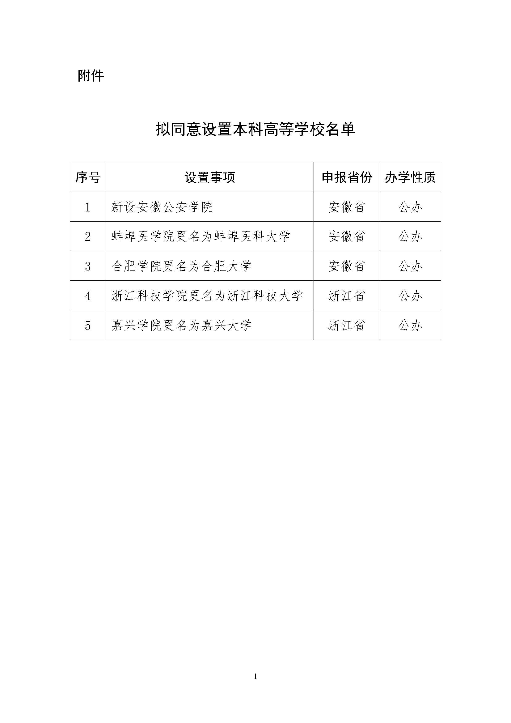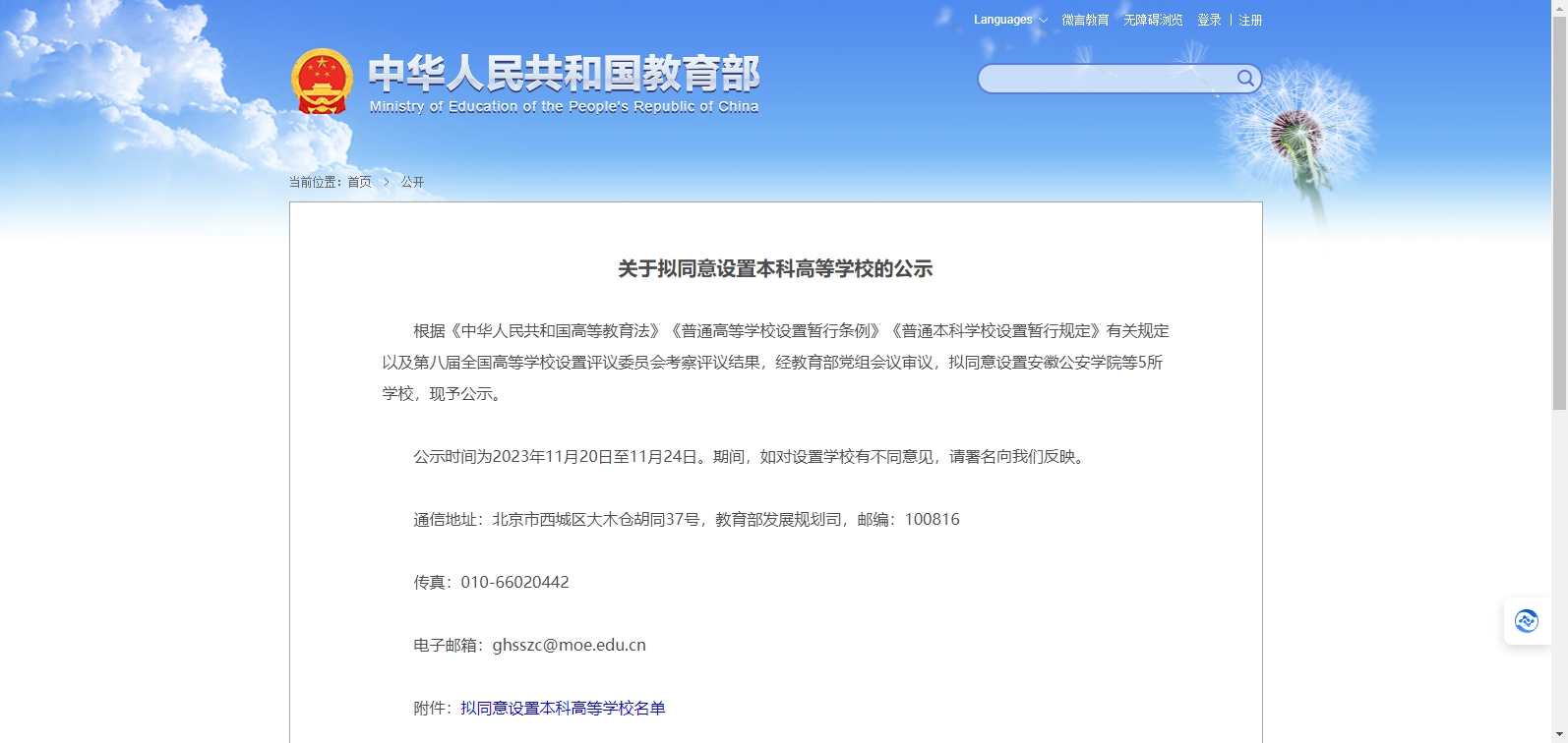 教育部發(fā)布《關于擬同意設置本科高等學校的公示》。公示指出,根據(jù)《中華人民共和國高等教育法》《普通高等學校設置暫行條例》《普通本科學校設置暫行規(guī)定》有關規(guī)定以及第八屆全國高等學校設置評議委員會考察評議結果,經(jīng)教育部黨組會議審議,擬同意設置安徽公安學院等5所學校,現(xiàn)予公示。公示時間為2023年11月20日至11月24日。