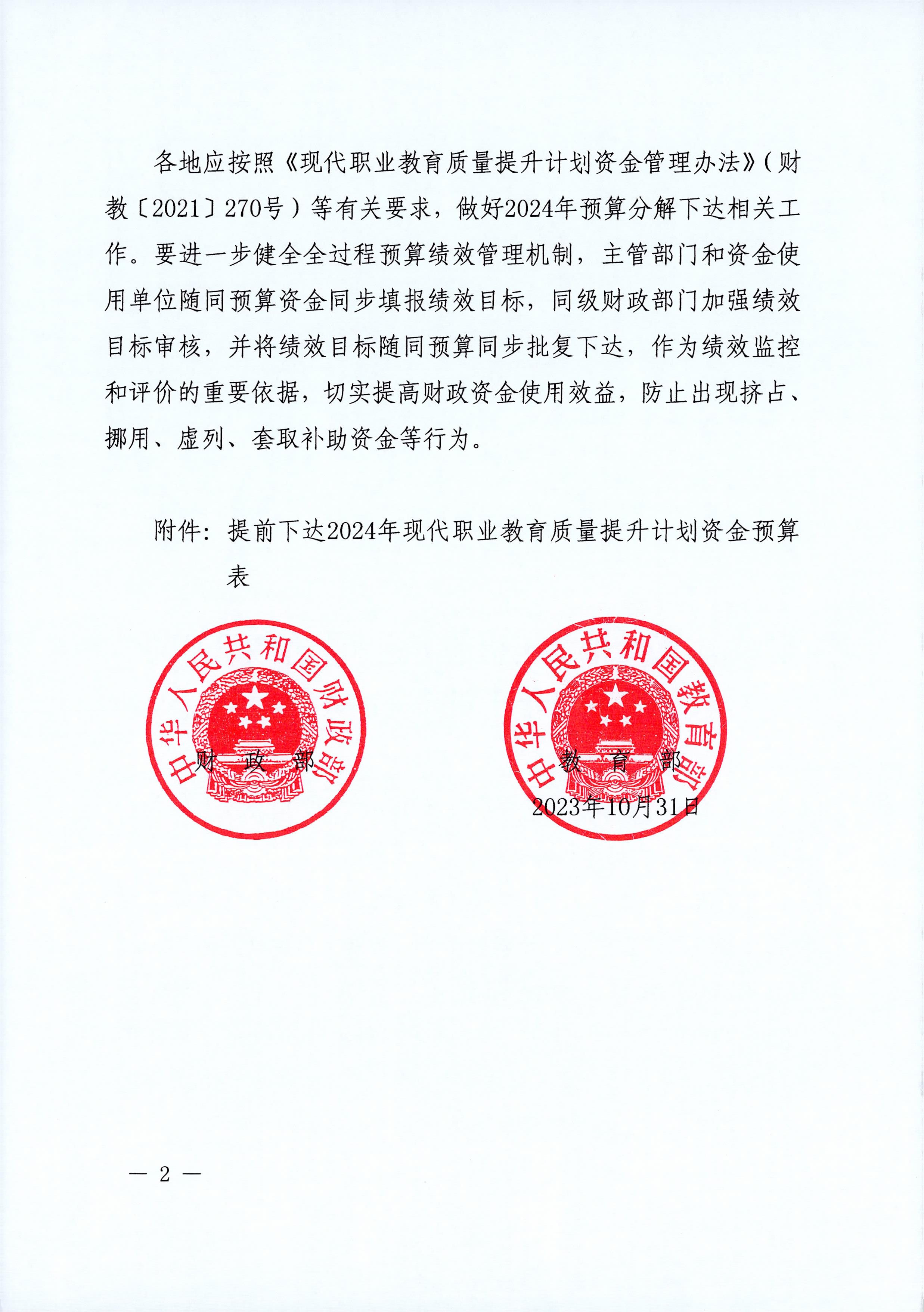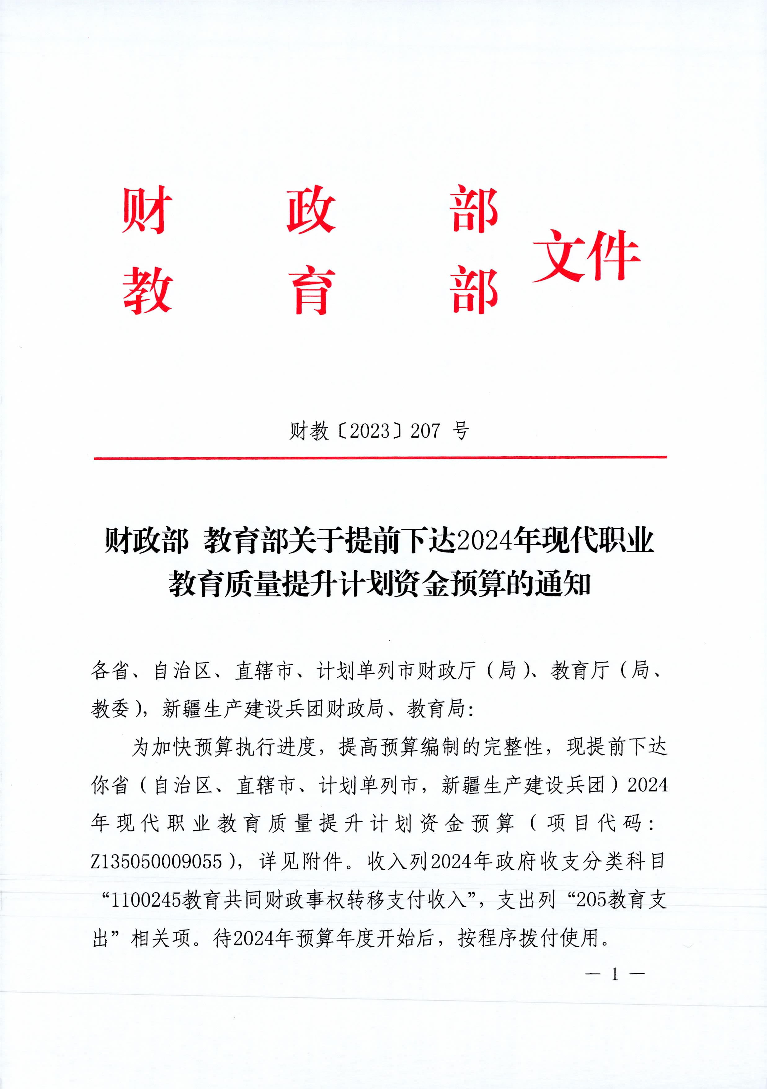 近日,財(cái)政部、教育部發(fā)布《提前下達(dá)2024年現(xiàn)代職業(yè)教育質(zhì)量提升計(jì)劃資金預(yù)算的通知》