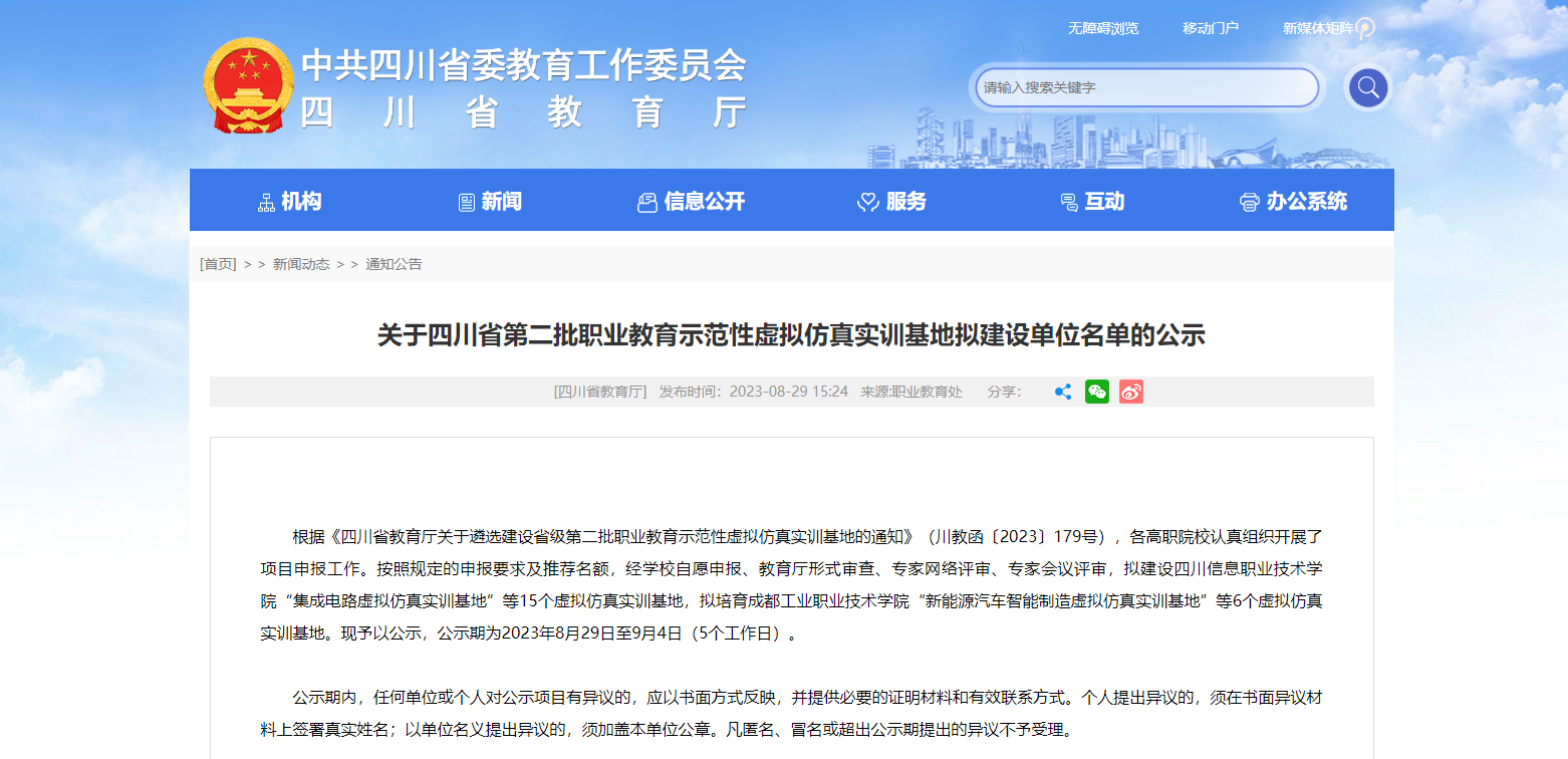 近日,四川省教育廳根據(jù)《四川省教育廳關(guān)于遴選建設(shè)省級第二批職業(yè)教育示范性虛擬仿真實(shí)訓(xùn)基地的通知》(川教函〔2023〕179號),公布了第二批職業(yè)教育示范性虛擬仿真實(shí)訓(xùn)基地擬建設(shè)單位名單,擬建設(shè)四川信息......