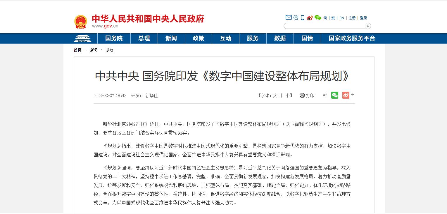 中共中央 國務院印發(fā)《數(shù)字中國建設整體布局規(guī)劃》