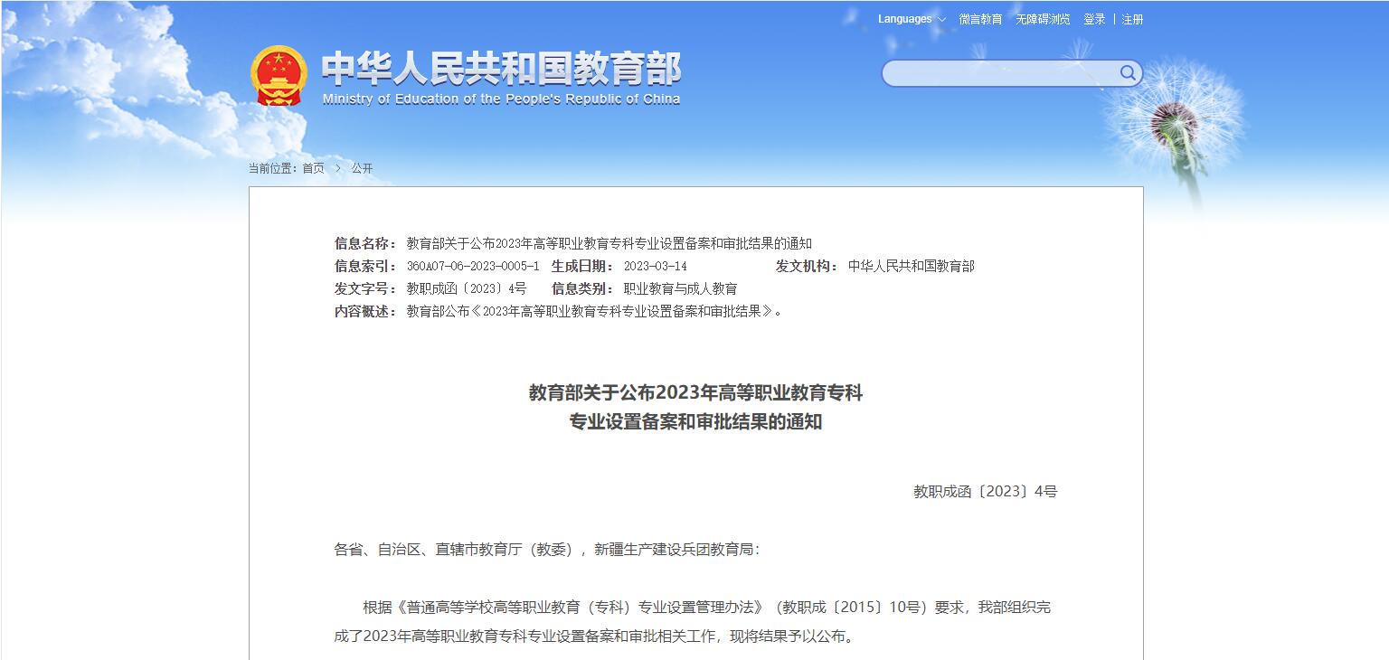 日前,教育部組織完成了2023年高等職業(yè)教育??茖I(yè)設置備案和審批相關(guān)工作,并公布結(jié)果,經(jīng)省級教育行政部門備案并在教育部匯總的2023年擬招生專業(yè)點共65808個,備案結(jié)果可在全國職業(yè)院校專業(yè)設置管理......